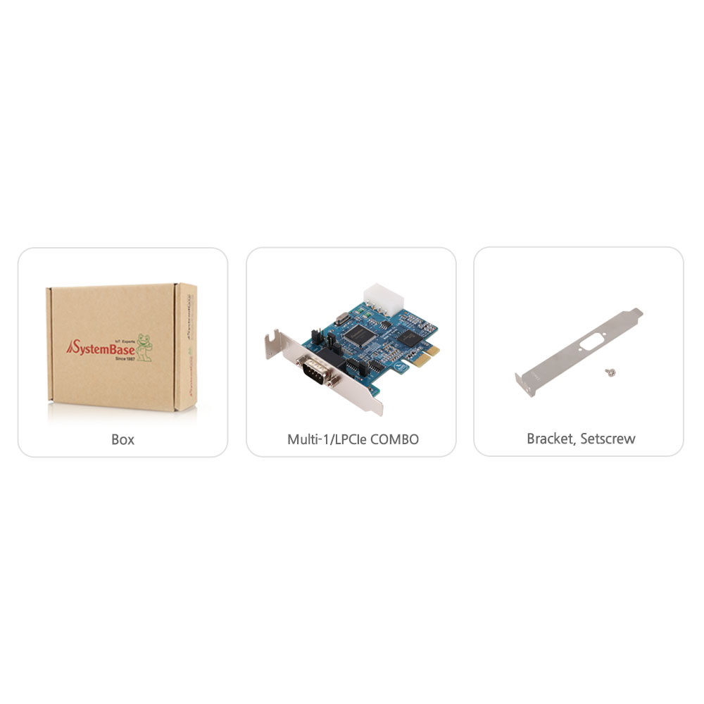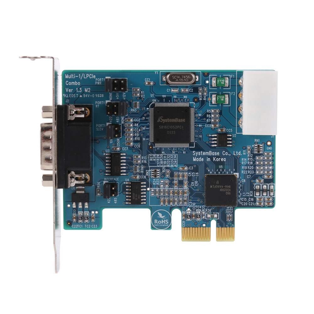 SystemBase「Multi-1/LPCIe」は、SystemBaseが開発した高性能PCIシリアルコントローラ半導体「SB16C1052PCI」を搭載した1ポートシリアルインターフェースPCIeカードです。