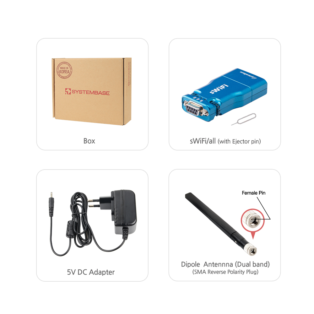 SystemBase 「sWiFi/all」はRS232/422/485対応機器にWiFi無線通信機能を提供する超小型デュアルバンド無線ゲートウェイコンバータです。 DB9端子のシリアルポートを備え、RS232またはRS422/485規格で、有線区間最高921.6Kbpsの通信速度と無線区間最高54Mbpsでの通信が可能。 「sWiFi/all」はネットワーク(TCP/IP)経由でシリアル機器の遠隔制御、モニタリング、データ通信が行えるCOM Port Redirectorプログラムを提供し、接続されたシリアル装置を別途のプログラムなしですぐに使用できます。